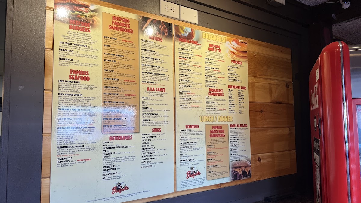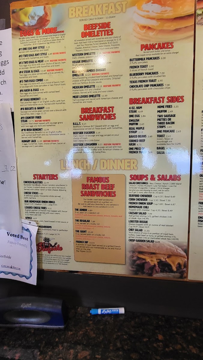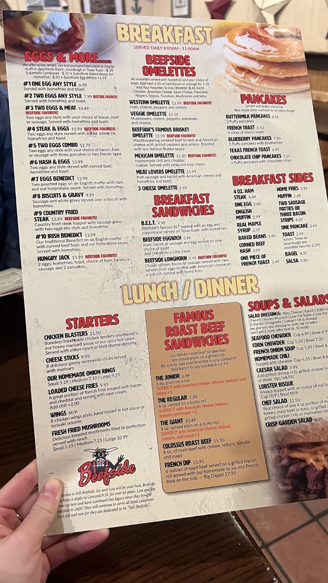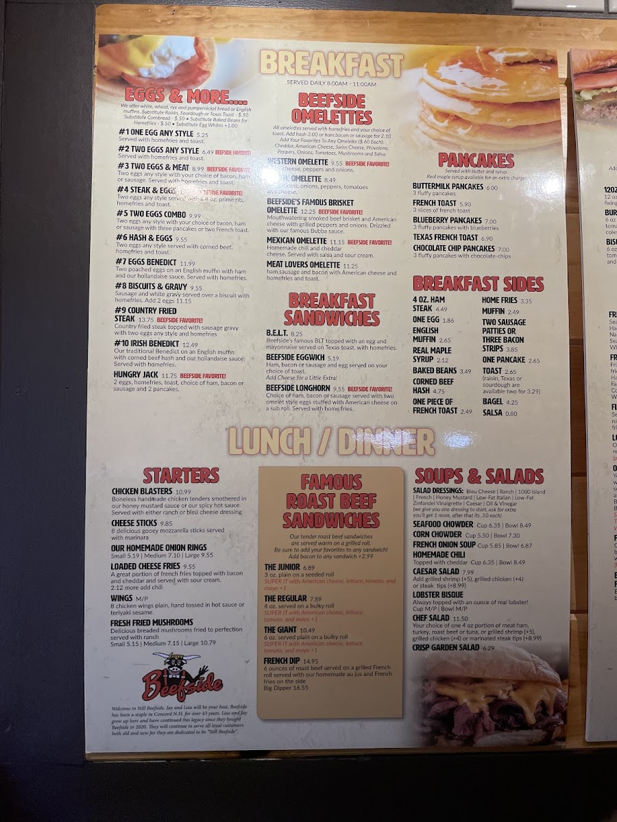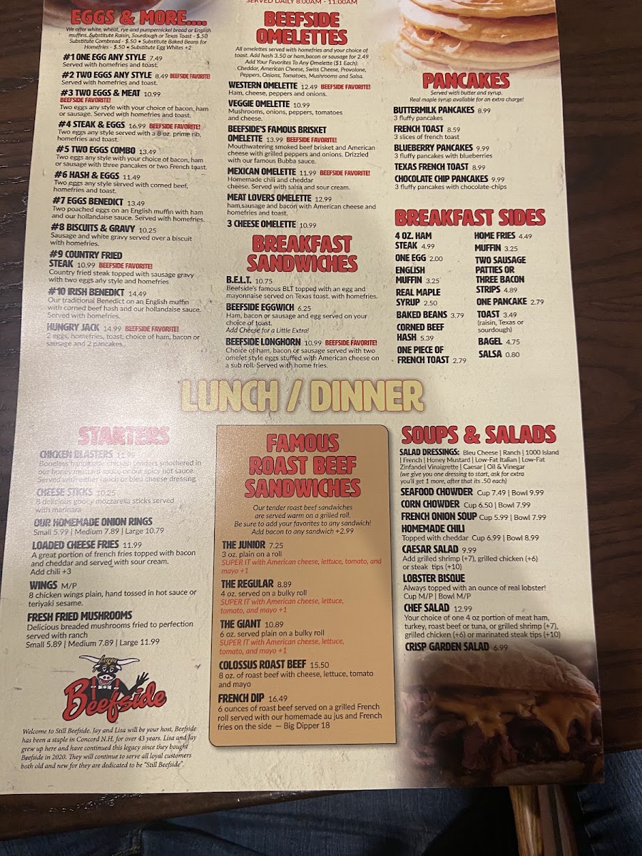 Beefside favorite! 2 eggs, homefries, toast, choice of ham, bacon or sausage and 2 pancakes.